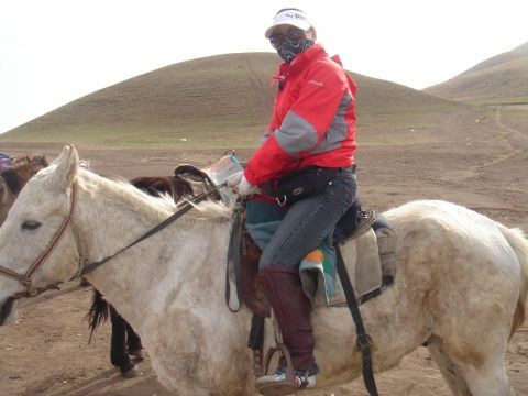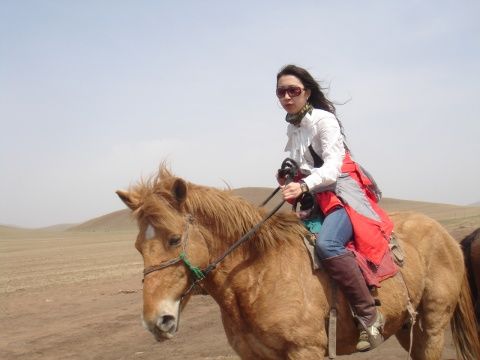 我們的馬隊在兩個向導的帶領下,一會兒在草原悠閑慢步,一會兒又急弛起來,我隨著馬兒的奔跑,在馬背上忽上忽下的顛簸著,看著前面涼水隨著馬兒扭動的身姿,不由哈哈笑起來:“涼水,你跳舞真好看,看你扭的腰,左右擺動著真是迷死人呀”涼水也是第一次騎馬,不敢掉以輕心啊,頭也不回,專心拉著馬韁“姐,我可沒特意呀,她自己會扭呢”。這時候的草原風很大,強勁的風裹著沙粒迎面撲來,打在臉上有點生疼的感覺,我趕緊拉上蒙面圍脖,不再說話,只是隨著馬隊心情緊張地馳奔了。一路上我小心翼翼的拉著馬韁,還不時和小白馬套著近乎:“小白馬呀小白馬,我喜歡你哦,我們是好朋友了,你要溫柔點,你可千萬不要把我一屁股撅下來哦”。我的小白馬還真夠朋友的,雖然路程中有好幾次差點馬失前蹄,但最終還是安全的把我帶回了村莊。