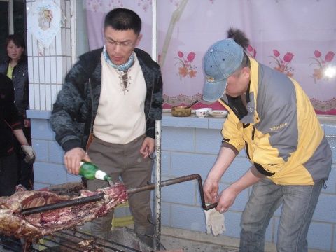 夜晚的風漸漸大起來,草原的特點就是早晚溫差極大,中午我們還穿著短袖汗流浹背的在馬上狂奔,傍晚就穿著厚厚的沖鋒衣在農(nóng)家院里溜達著看李大嘴和面包烤全羊了。李大嘴也不愧為優(yōu)秀的廚藝大師,不但菜燒得好,燒烤功夫也一流啊,他和面包不辭辛苦的為我們烤著全羊,讒嘴的我們實在忍不住那帶著孜然香味的焦黃鮮嫩的羊肉的誘惑,哄搶著用小刀迎著炭火的煎烤,一片一片的割著羊肉吃,等李大嘴和面包把整只羊烤好了,烤架上的羊也只剩下骨架了,呵呵。夜,也慢慢黑透了,風越來越大,本來準備好的篝火晚會,因為風大的原因取消了,娛樂活動也只好由戶外變成每個大炕上的牌局了,殺人、升級、斗地主…玩法多樣百出,歡笑聲中夾雜著:“喝,我們繼續(xù)喝,喝完這瓶再開一瓶”的酒鬼的聲音,我不太會打牌,自然就成了酒鬼中的一員了,呵呵。